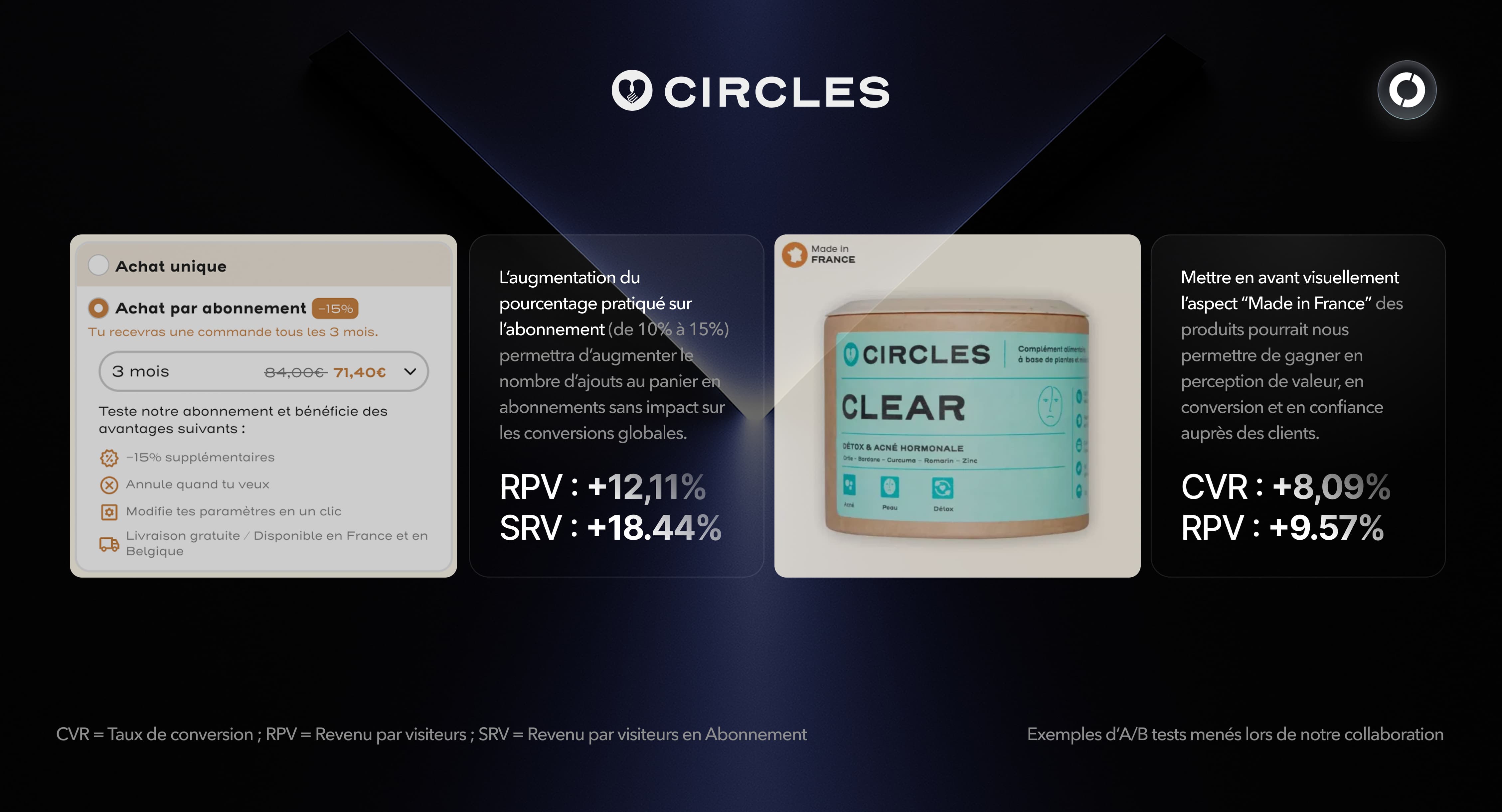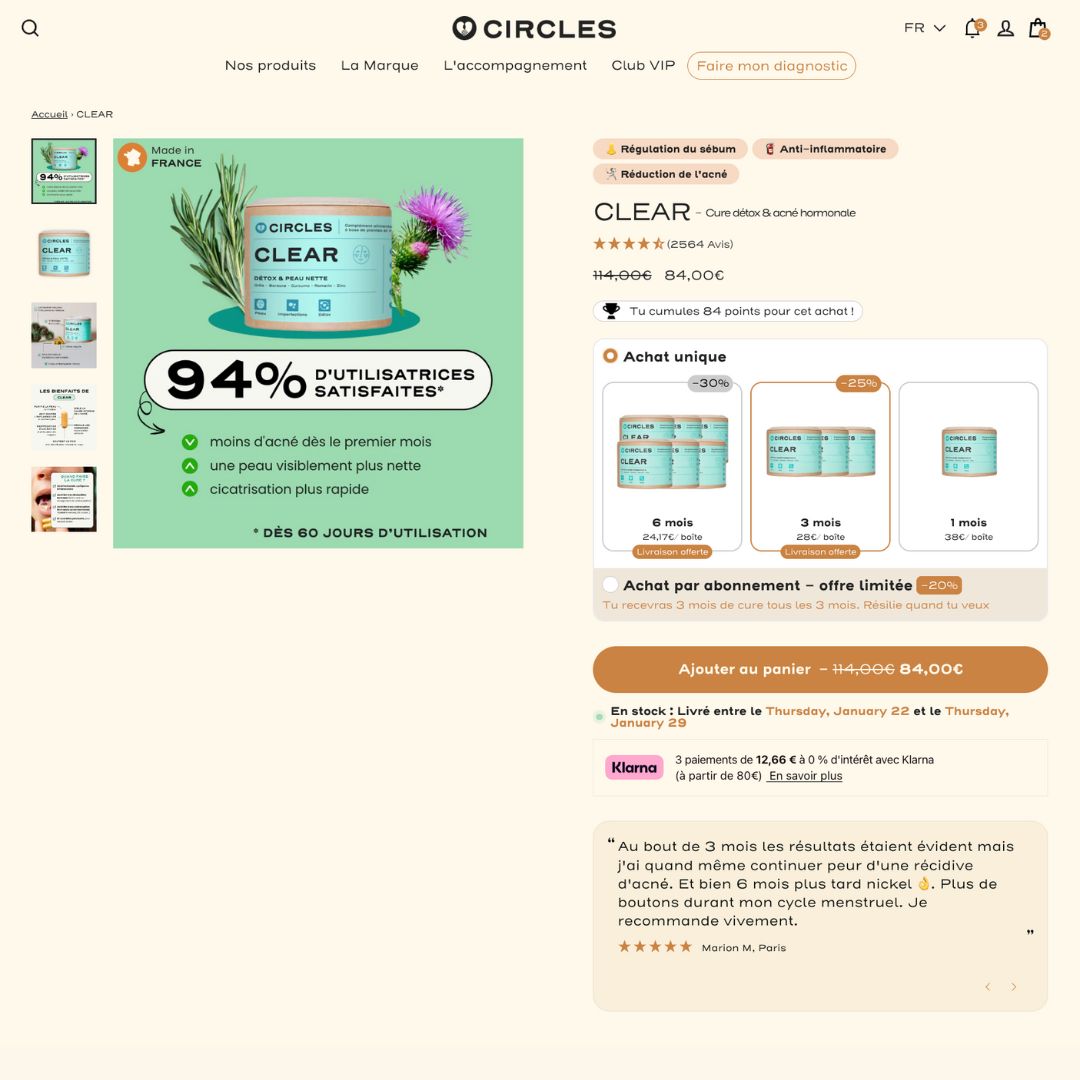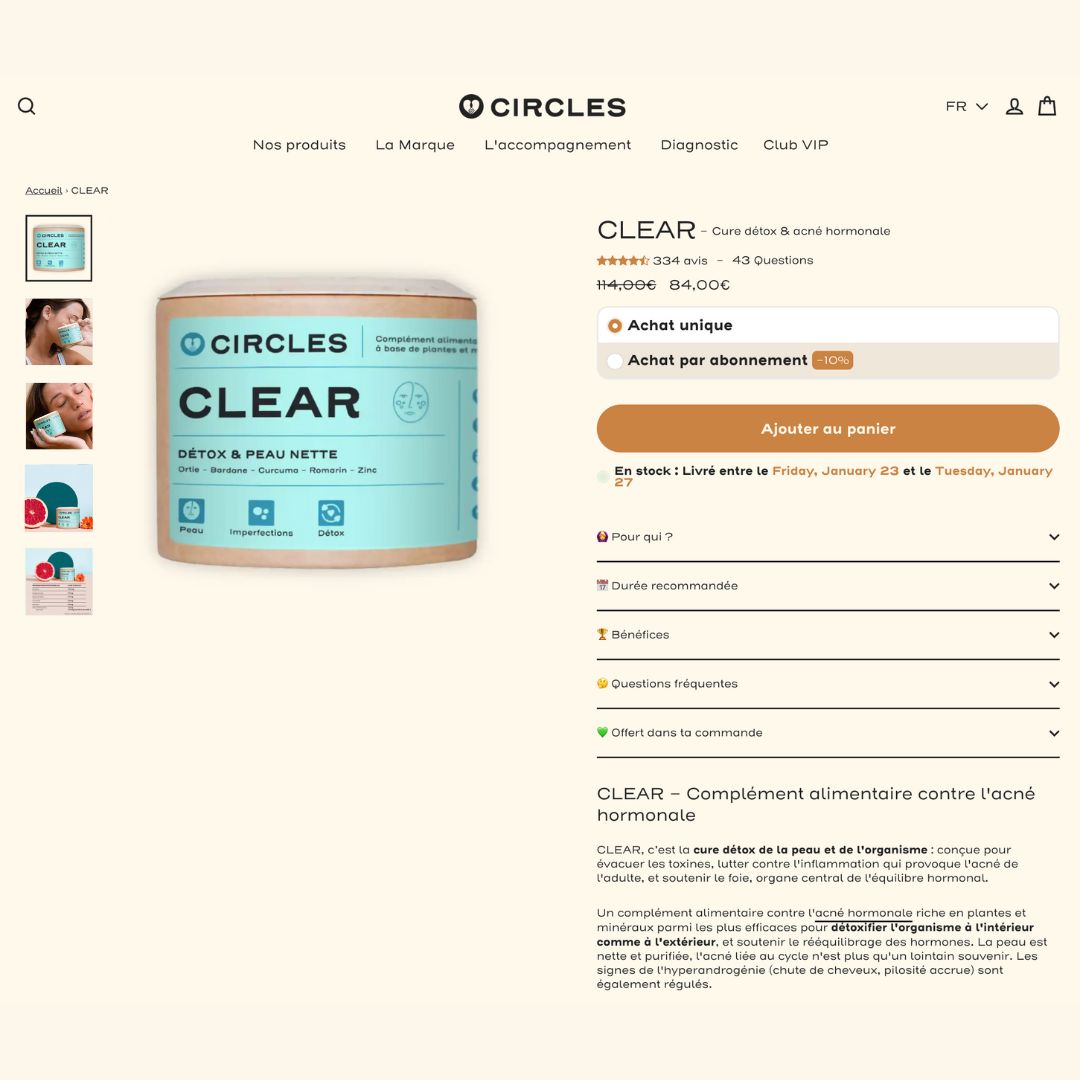 L’enjeu principal était de pouvoir faire évoluer le site et l’offre sur la base de décisions mesurées, en s’assurant que chaque changement apportait une réelle valeur business. CIRCLES recherchait une agence CRO capable non seulement de tester, mais aussi de comprendre en profondeur les mécanismes du e-commerce, afin de l’épauler sur des sujets stratégiques de long terme.